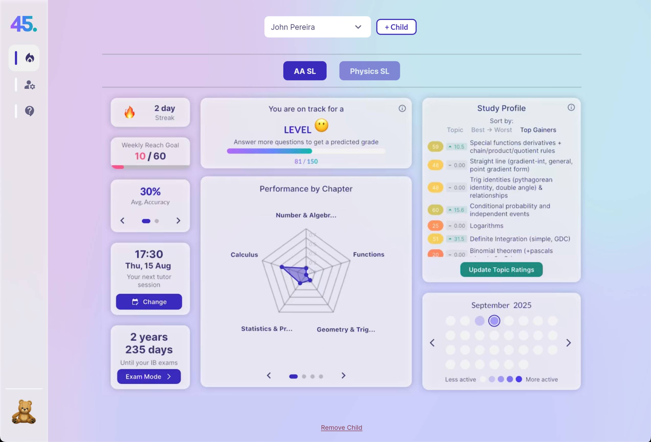Track your child's progress across subjects and topics with real-time data. Instantly understand how they’re doing, what they’re improving on, and where they might need extra support.